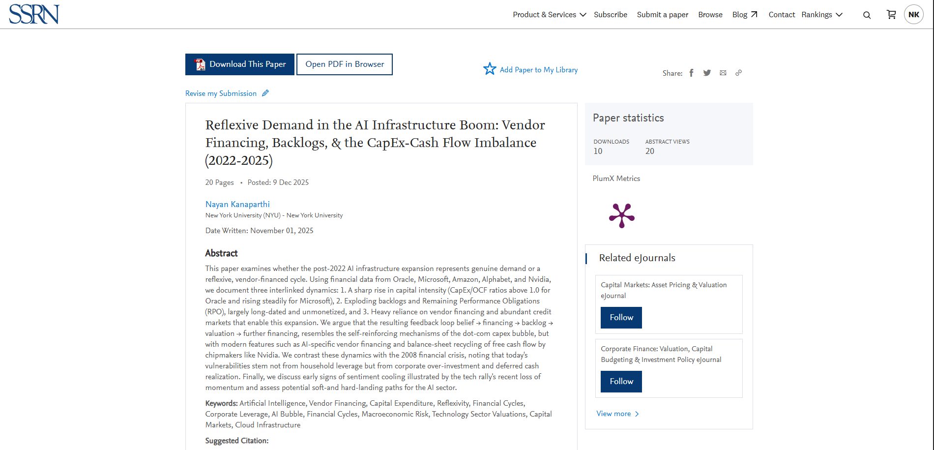 “Reflexive Demand in the AI Infrastructure Boom” analyzes the financial mechanics behind the rapid AI buildout from 2022 to 2025. The paper studies how vendor financing, long-dated backlogs, capital intensity, and credit conditions are shaping the current AI cycle across companies like Nvidia, Oracle, Microsoft, Amazon, and Google. It examines whether today’s surge in AI infrastructure reflects real user demand or a reflexive loop driven by financing structures, incentives, and expectations. The research connects this cycle to past investment booms while highlighting what makes the AI wave structurally different.